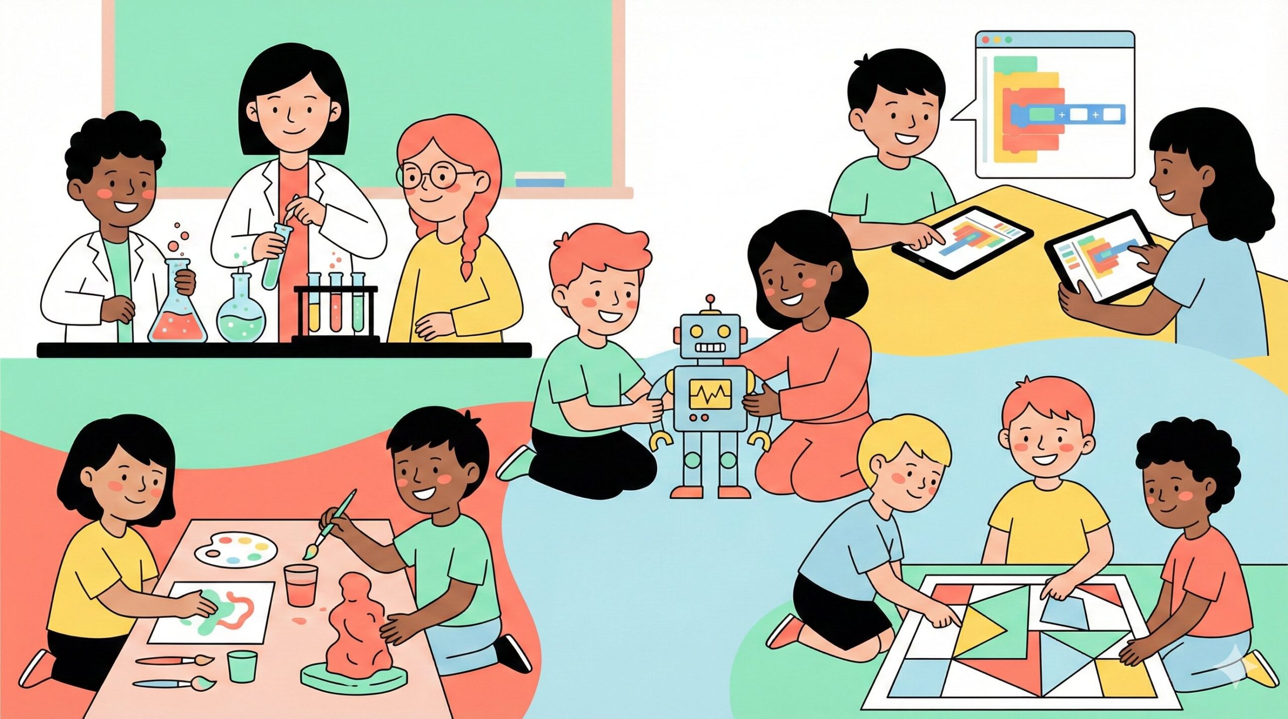 学校教育だけでなく、民間の教育サービスもSTEAM教育を取り入れる動きが加速しています。子ども向けプログラミング教室の多くが、単にコードを書くだけでなく、ロボット制作やアプリ開発、デジタルアート制作など、STEAM的な要素を取り入れたカリキュラムを提供しています。